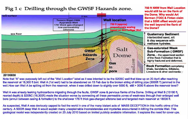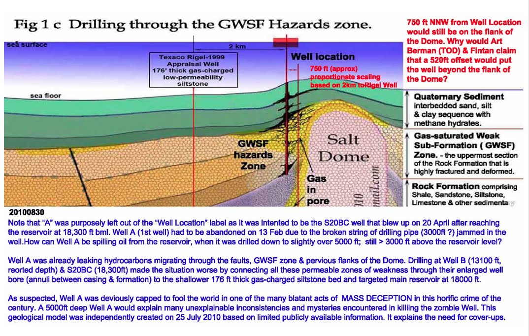 Well A could not be the well that blew up on 20 April 2010. At 5000 ft bml, the base of Well A is still 13,000 ft above the reservoir. Well A was already leaking hydrocarbon migrating through the faults, GWSF zone and the pervious flanks of the Dome or whatever vertical structural deformities. Well B was drilled to 13,100 ft.